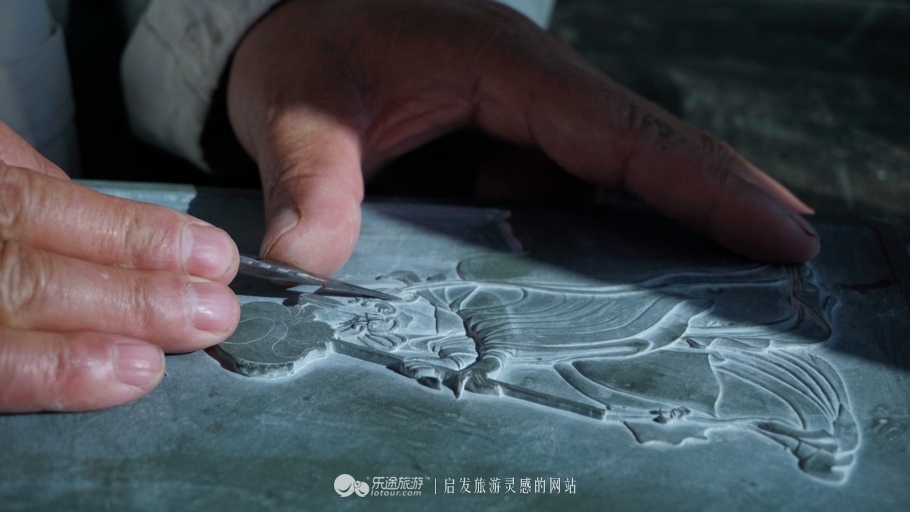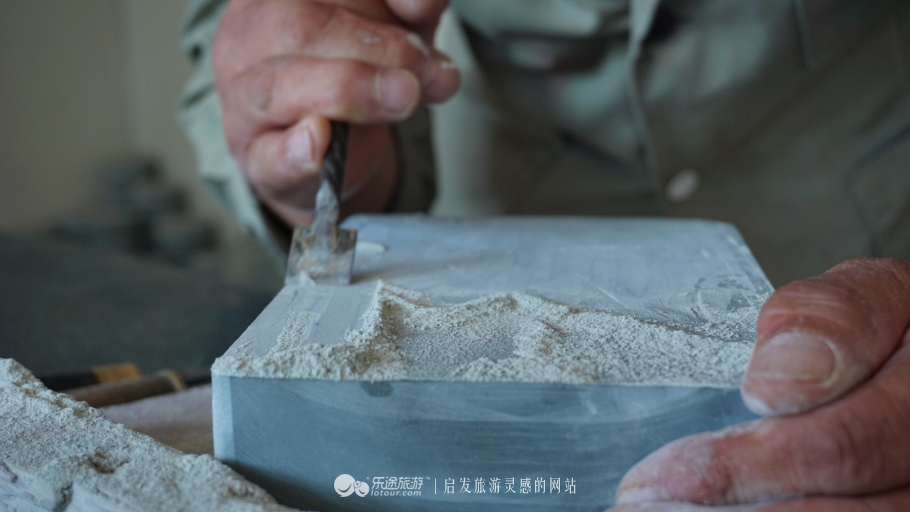阳光下,工匠师傅双手紧握着平铲,在原石上来来回回的去除着瑕疵,原石的碎屑在铲刃前飞舞着,如同飞舞的精灵,在向世人诉说着匠人精神的传承。