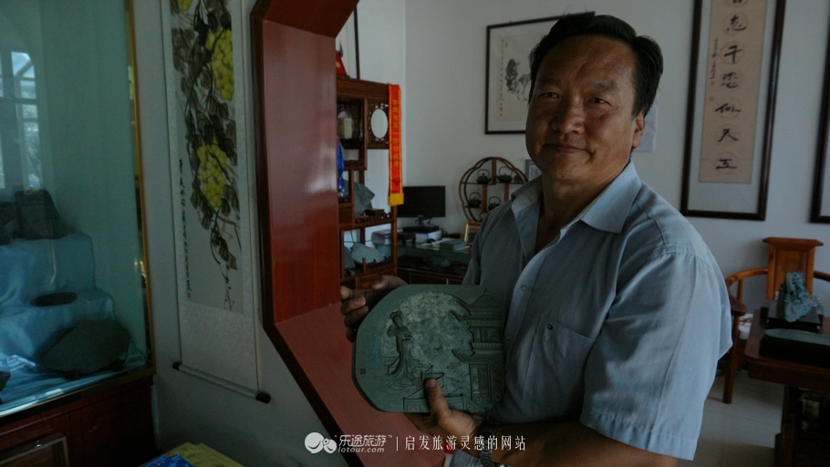 王老师是一个面容和善的中年人,他很热情的接待了我们这些慕名而来的访客们,在工作室的正房展厅里,一块块雕刻造型各异的砚台在阳光的照射下,散发着“卓尼洮砚”特有的墨绿色,展厅的墙壁上挂满了王老师各个时期的照片和在他的操刀下,诞生的洮砚获得的殊荣和奖状。